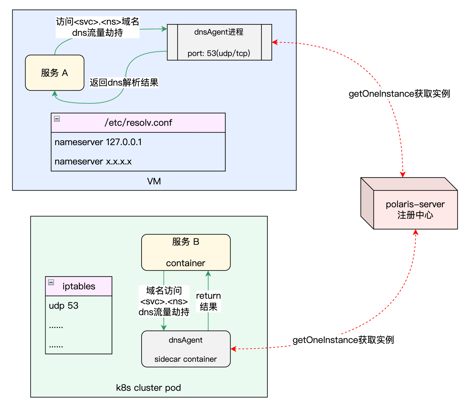 - polaris-controller: 完成 polaris-sidecar 容器注入到业务 POD 中,并下发 iptables 指令拦截业务容器的 DNS 请求,将其转发到 polaris-sidecar 中